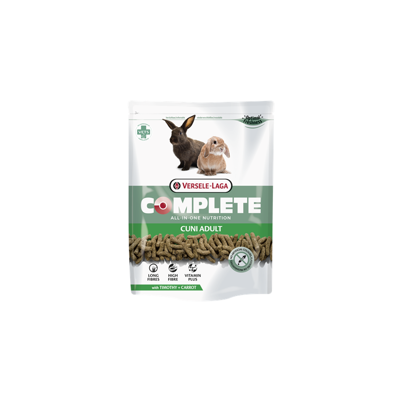 Versele-Laga Complete Cuni Adult es "nutrición sin preocupaciones". Los pellets todo en uno, excepcionalmente sabrosos, evitan el comportamiento de alimentación selectiva. De este modo, su conejo recibe todos los nutrientes esenciales y se mantiene perfectamente saludable. El alimento rico en fibra con fibras largas está específicamente adaptado a las necesidades nutricionales de un conejo adulto. Versele-Laga Complete Cuni adult ha sido desarrollado por veterinarios, basándose en conocimientos científicos avanzados.